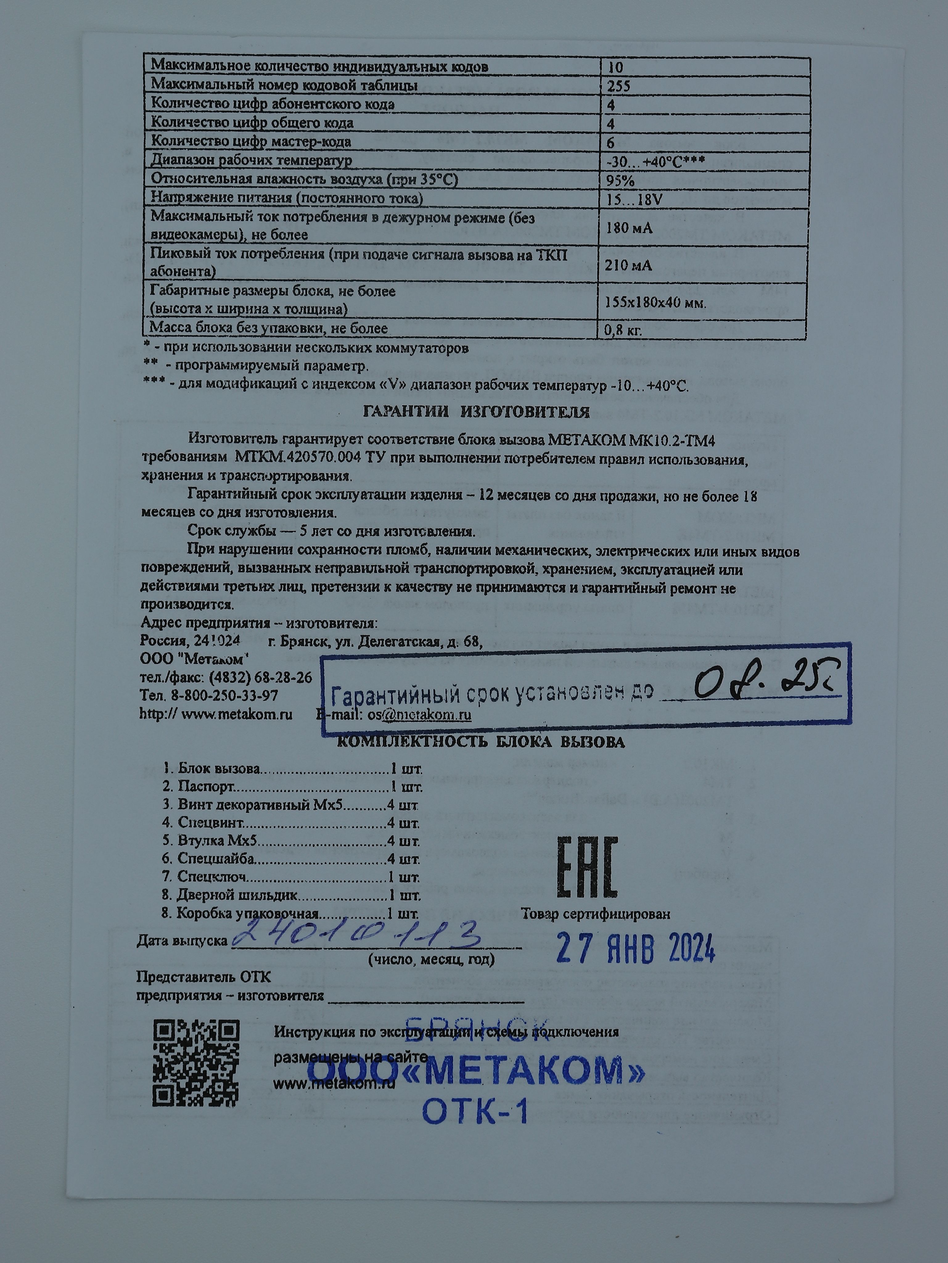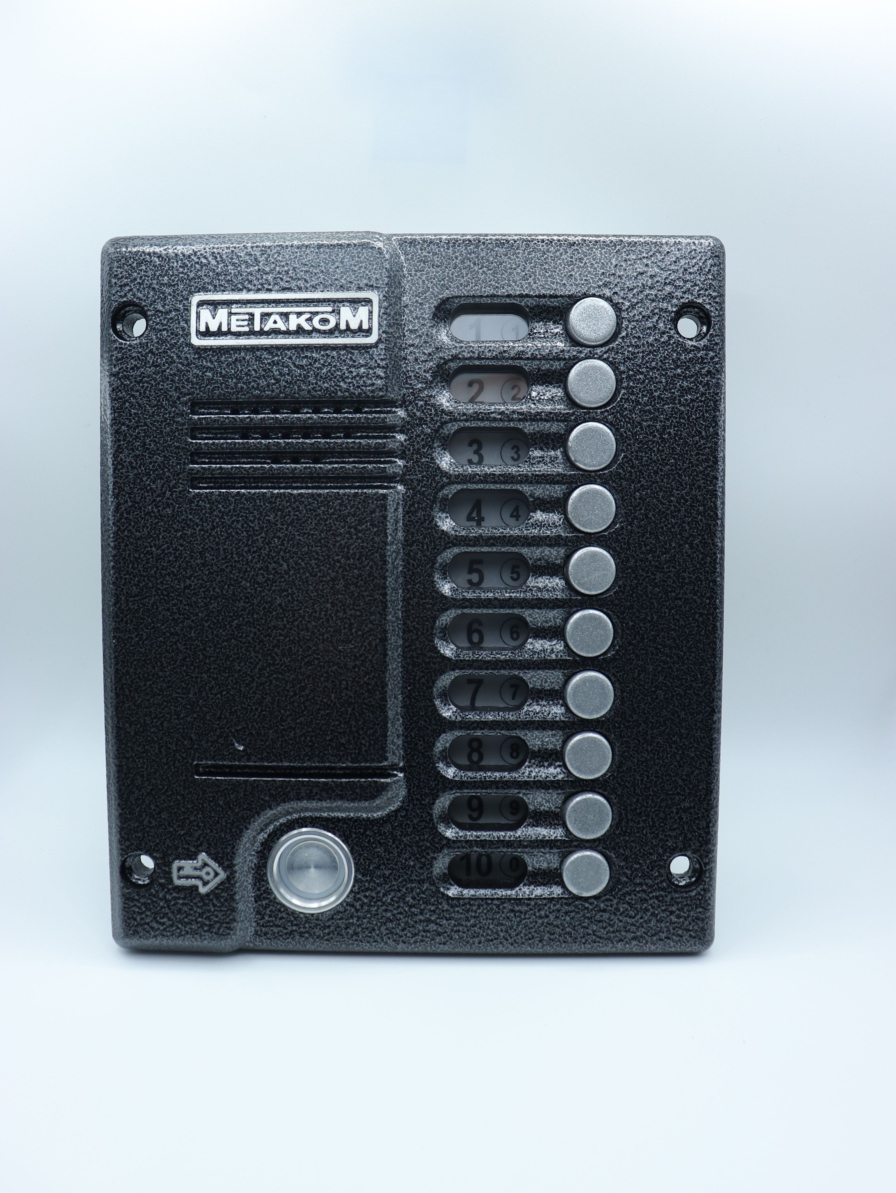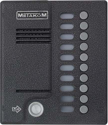 Блок вызова представляет собой специализированную микропроцессорную систему, предназначенную для установки в многоквартирных домах, офисах для организации селекторной связи с координатной системой адресации с числом абонентов до 10В качестве абонентских ключей используются электронные ключи METAKOM TM2002, МЕТАКОМ TM2003(A,B) или Dallas iButtontm – DS1990A (для версии ТМ.В качестве оконечных устройств, устанавливаемых у абонентов, рекомендуются трубки квартирные переговорные (ТКП) типа ТКП-01, ТКП-05М, ТКП-06М, ТКП-10М, ТКП-12М, ТКП-14М или другие, предназначенные для домофонов с координатной системой адресации.Домофон обеспечивает подачу сигнала вызова на ТКП абонента, дуплексную связь посетителя с абонентом, дистанционное открывание замка по сигналу от ТКП.Замок также может быть открыт с помощью TM – ключа, с помощью кода, набираемого на блоке вызова, или нажатием кнопки ВЫХОД, устанавливаемой у входной двери внутри подъезда.