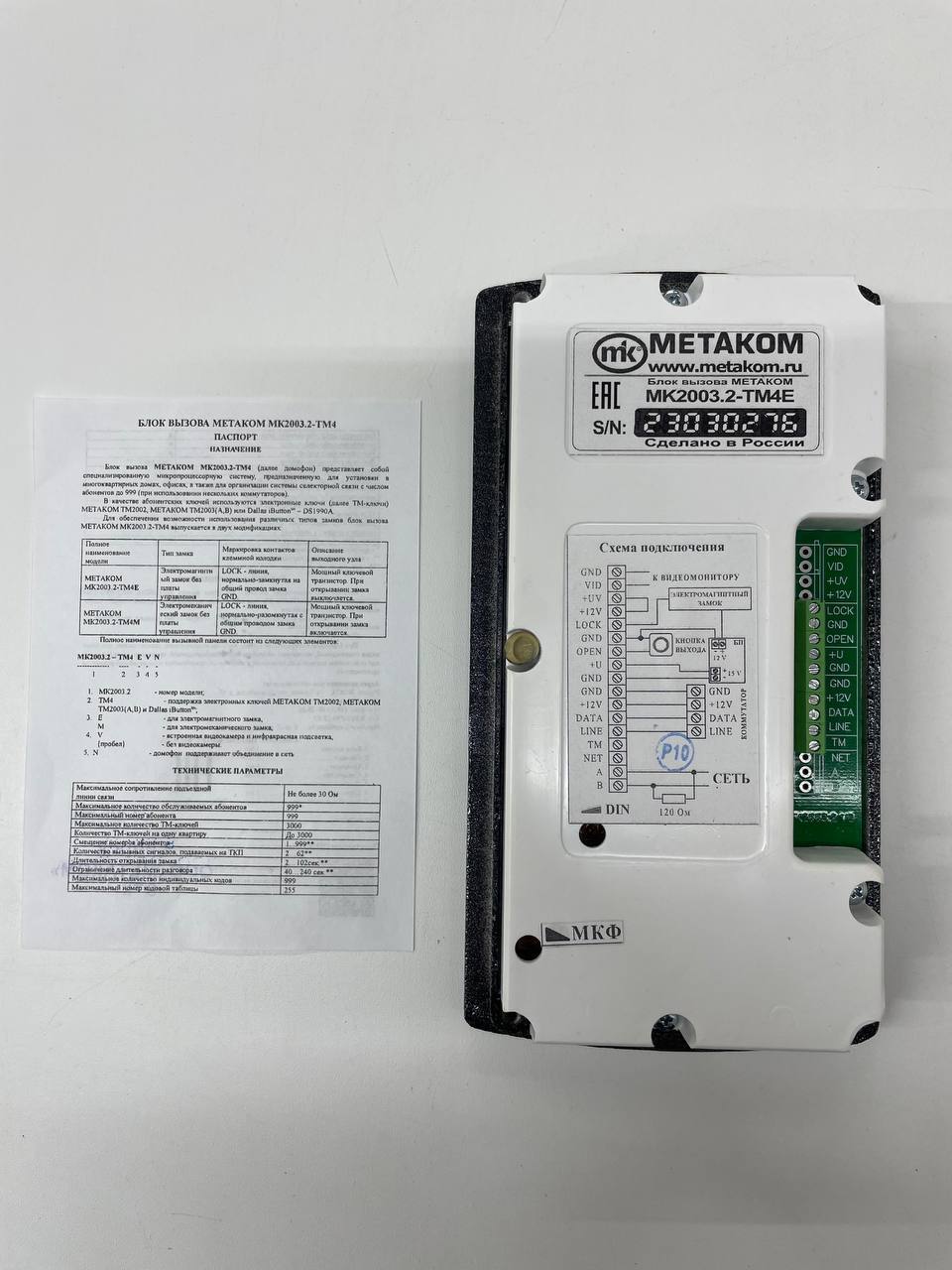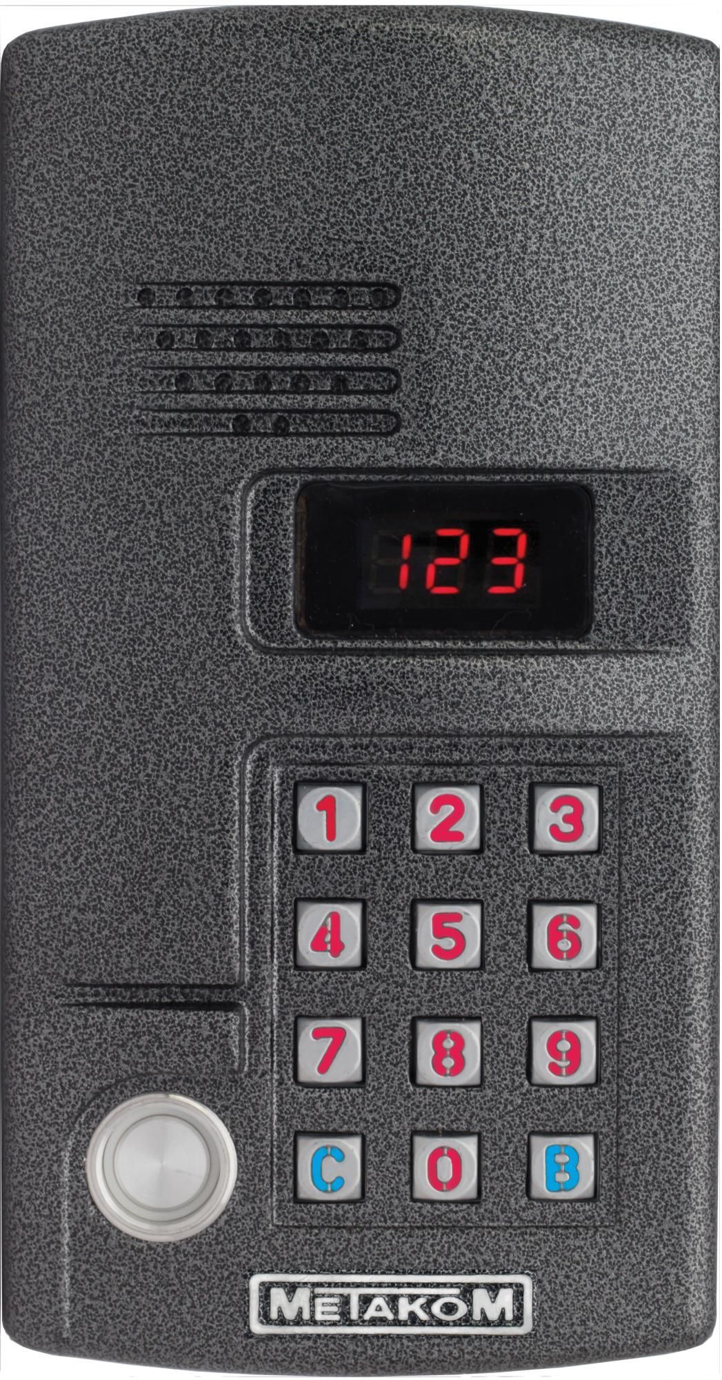 Многоабонентый антивандальный блок вызова МЕТАКОМ MK2003.2-TM4E, емкость абонентов до 999 (при использовании нескольких коммутаторов), возможность запрета работы домофона с ключами TM2002 или TM2003, индивидуальный/общий код. Рассчитан на работу с электромагнитным замком.
