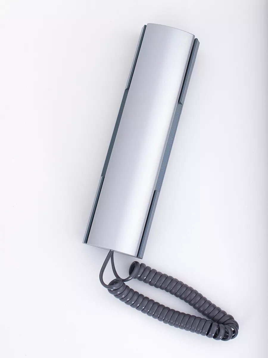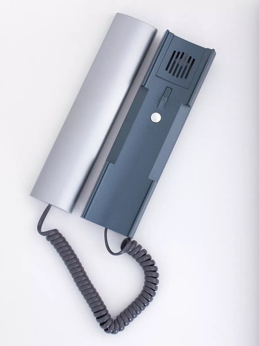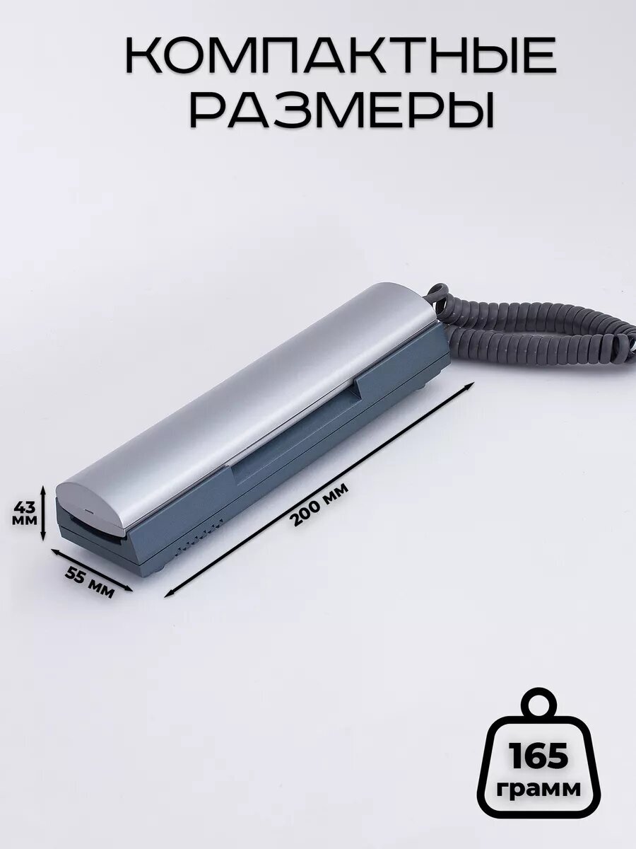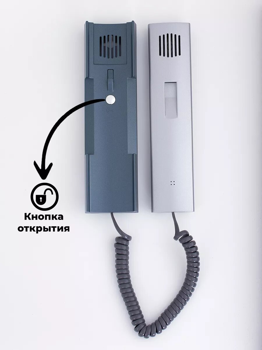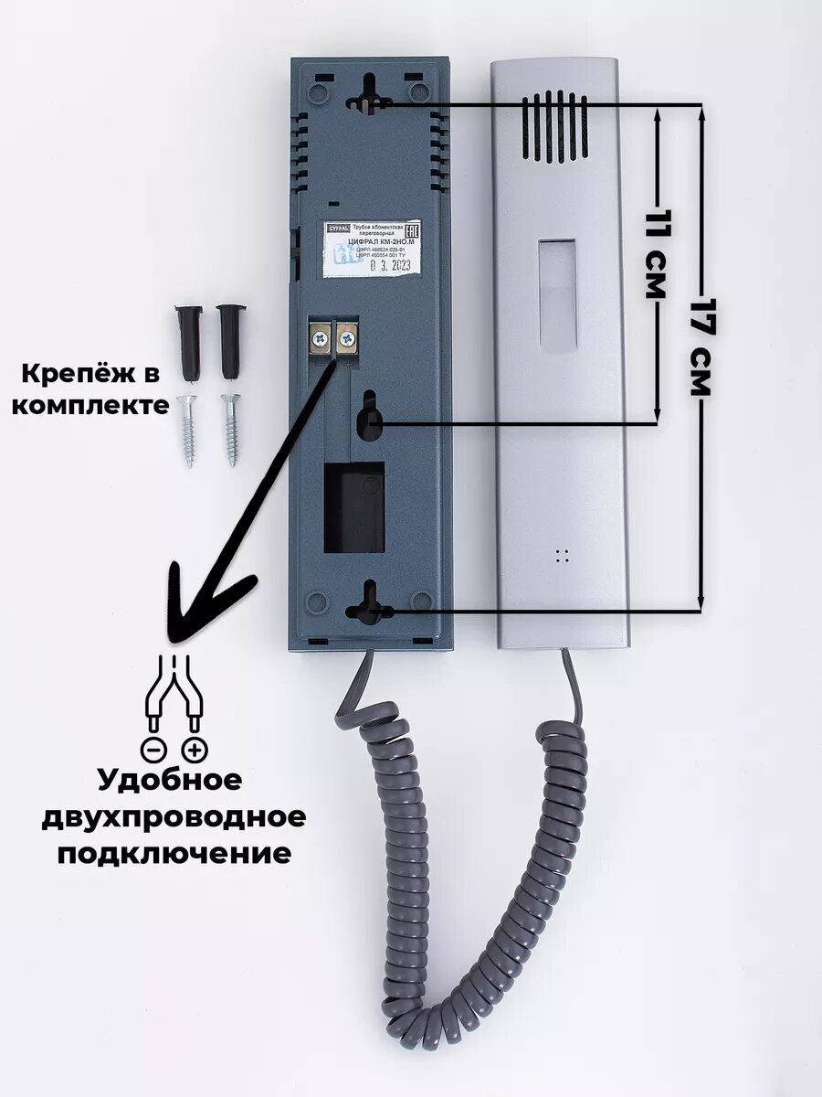 Корпус трубки покрашен в стильный серый металлик, а основание имеет красивый синий металлик. Ее компактные размеры (200х55х43 мм) позволяют легко установить трубку на стену с помощью стандартных саморезов или гвоздей - в комплекте вы найдете все необходимые элементы крепежа.