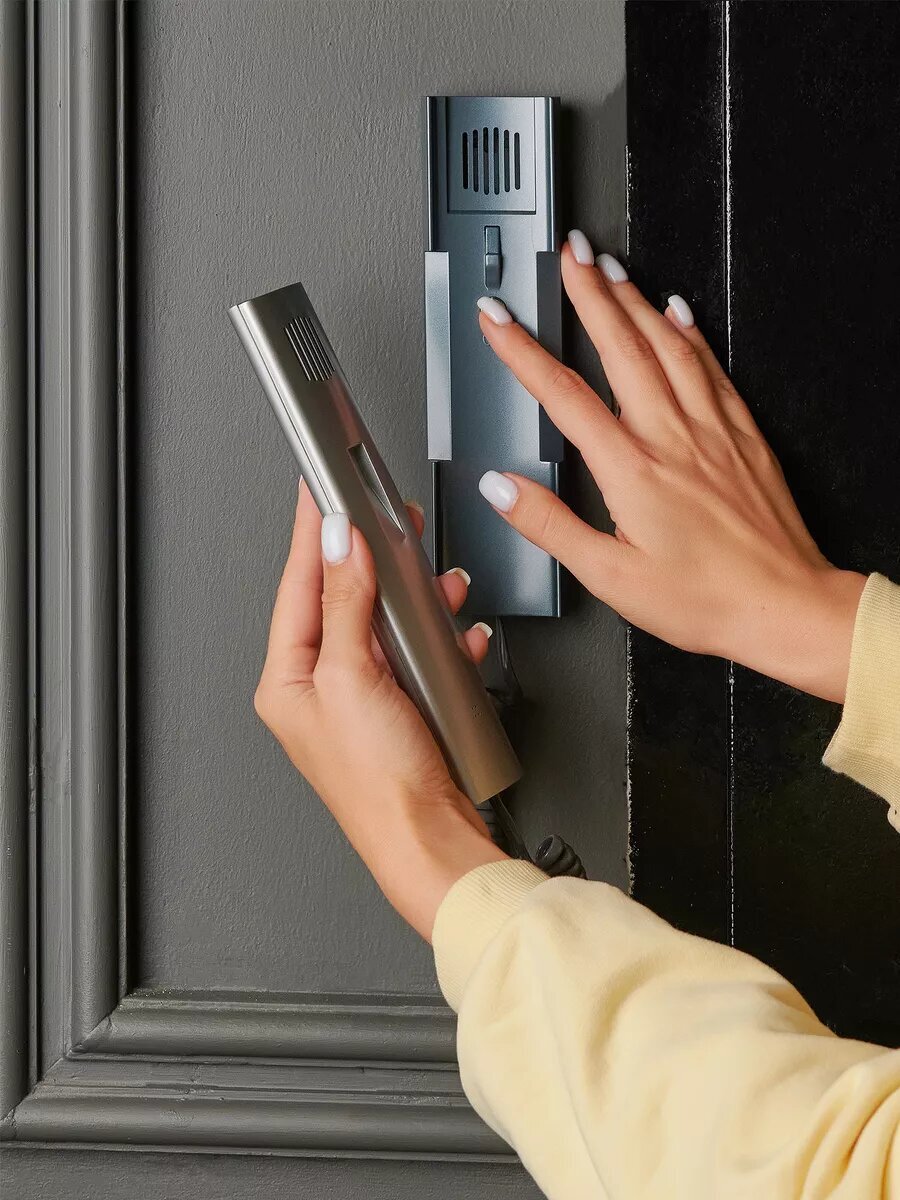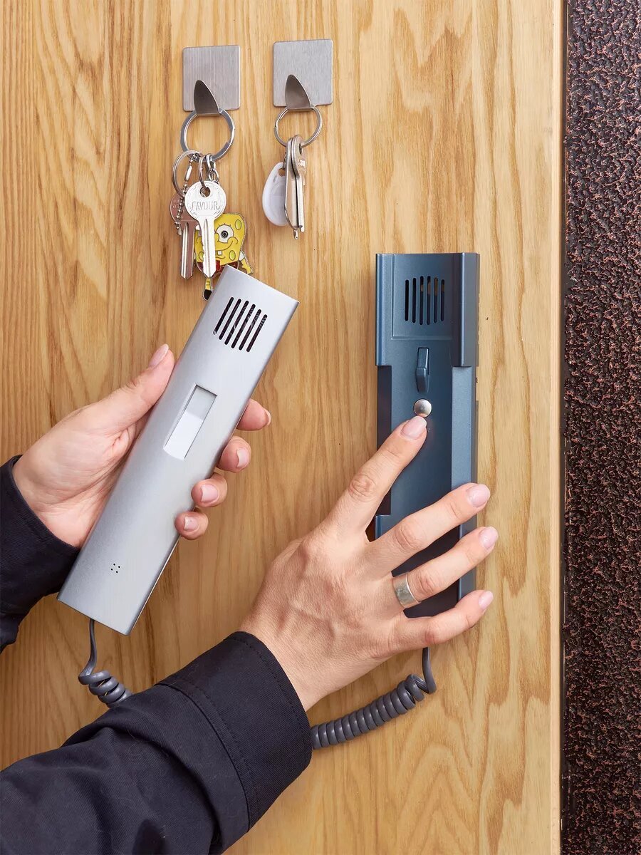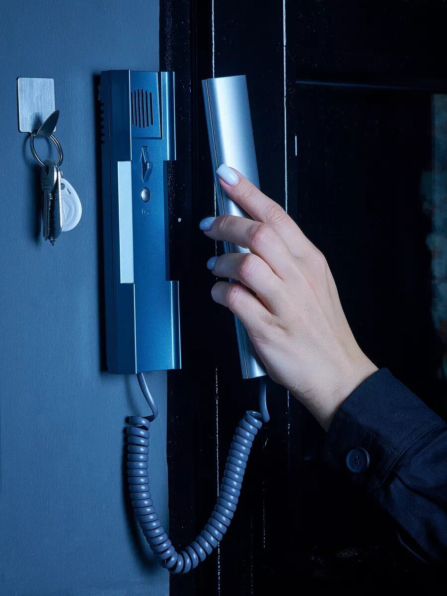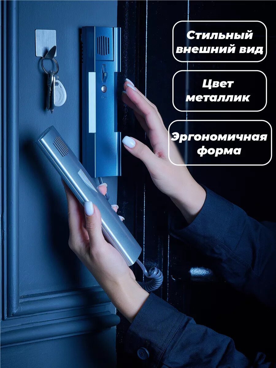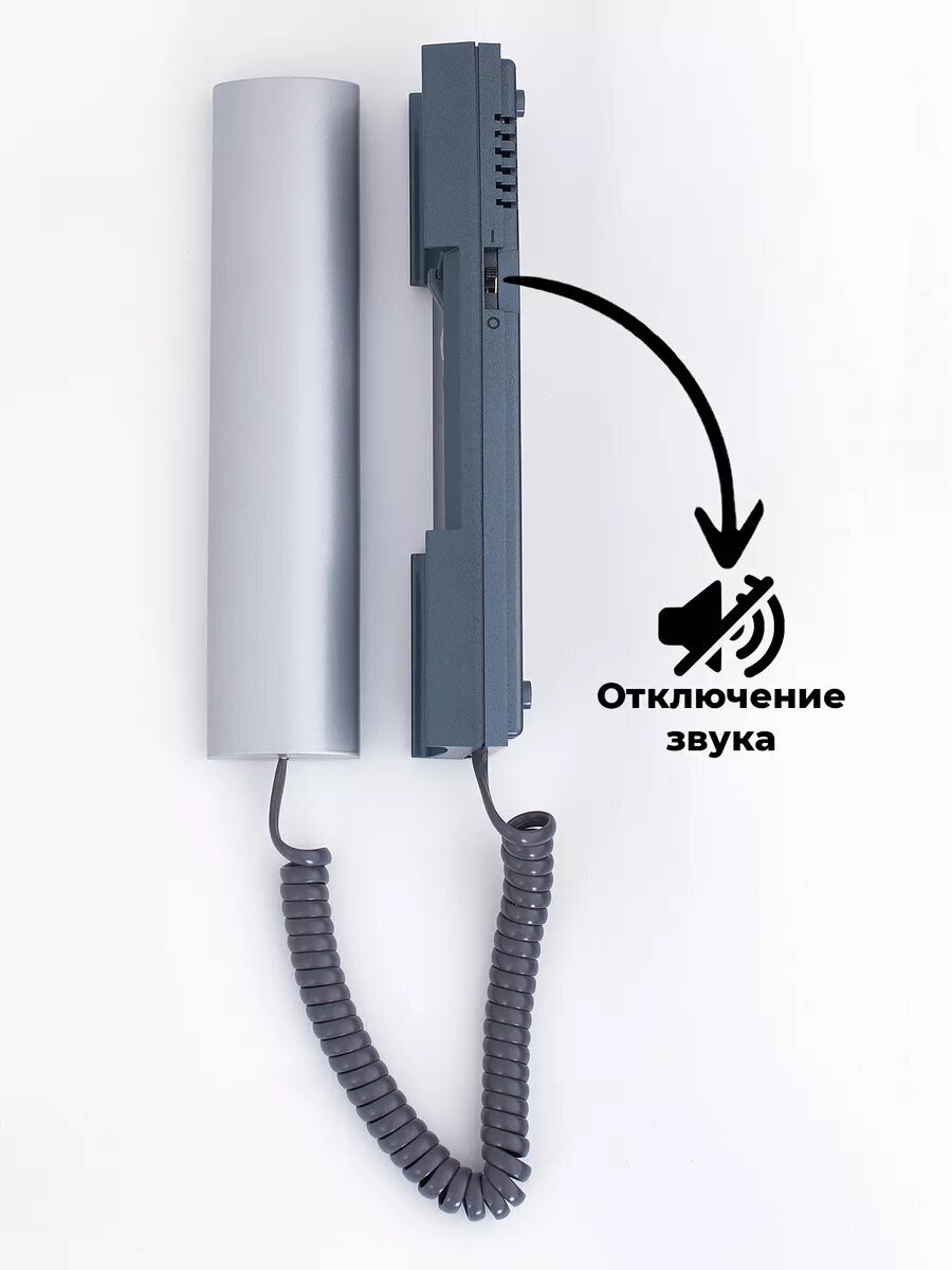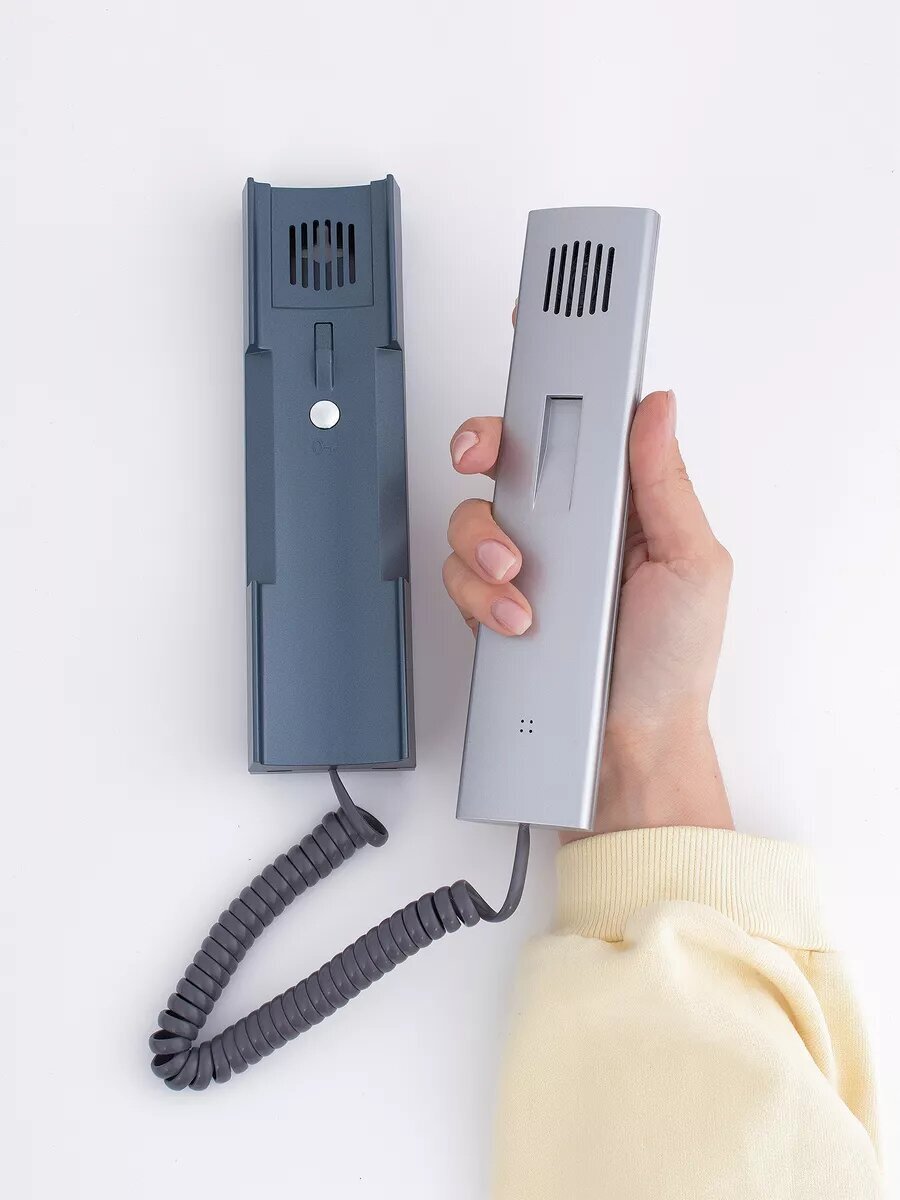Корпус трубки покрашен в стильный серый металлик, а основание имеет красивый синий металлик. Ее компактные размеры (200х55х43 мм) позволяют легко установить трубку на стену с помощью стандартных саморезов или гвоздей - в комплекте вы найдете все необходимые элементы крепежа.