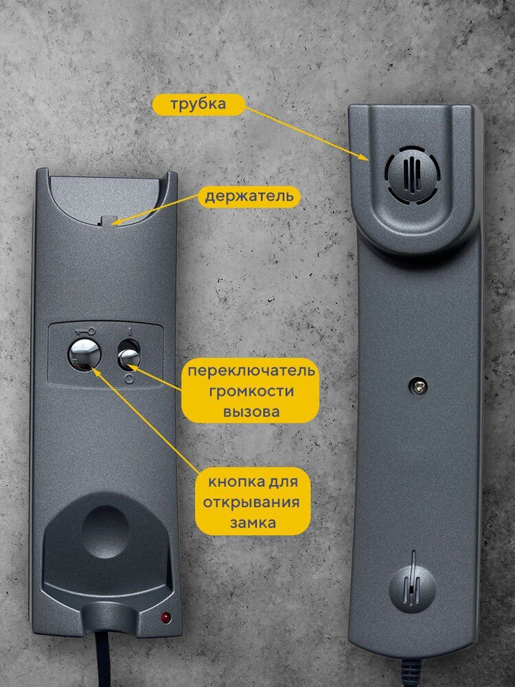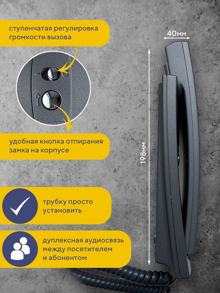 На корпусе трубки предусмотрены важные функциональные элементы. Кнопка удаленного отпирания замка позволяет вам легко открывать двери, не покидая комфорта своего дома, и она рабоча во время разговора с посетителем. Для вашего удобства в устройстве реализован переключатель режимов громкости сигнала вызова, который предлагает два варианта: «Тихий» (или ночной режим), позволяющий не беспокоить окружающих, и «Громкий», подходящий для ситуаций, когда нужно услышать звук вызова из дальней комнаты. Настройка режима громкости также влияет на громкость разговора с посетителем, что обеспечивает оптимальный уровень звучания в зависимости от ваших потребностей.