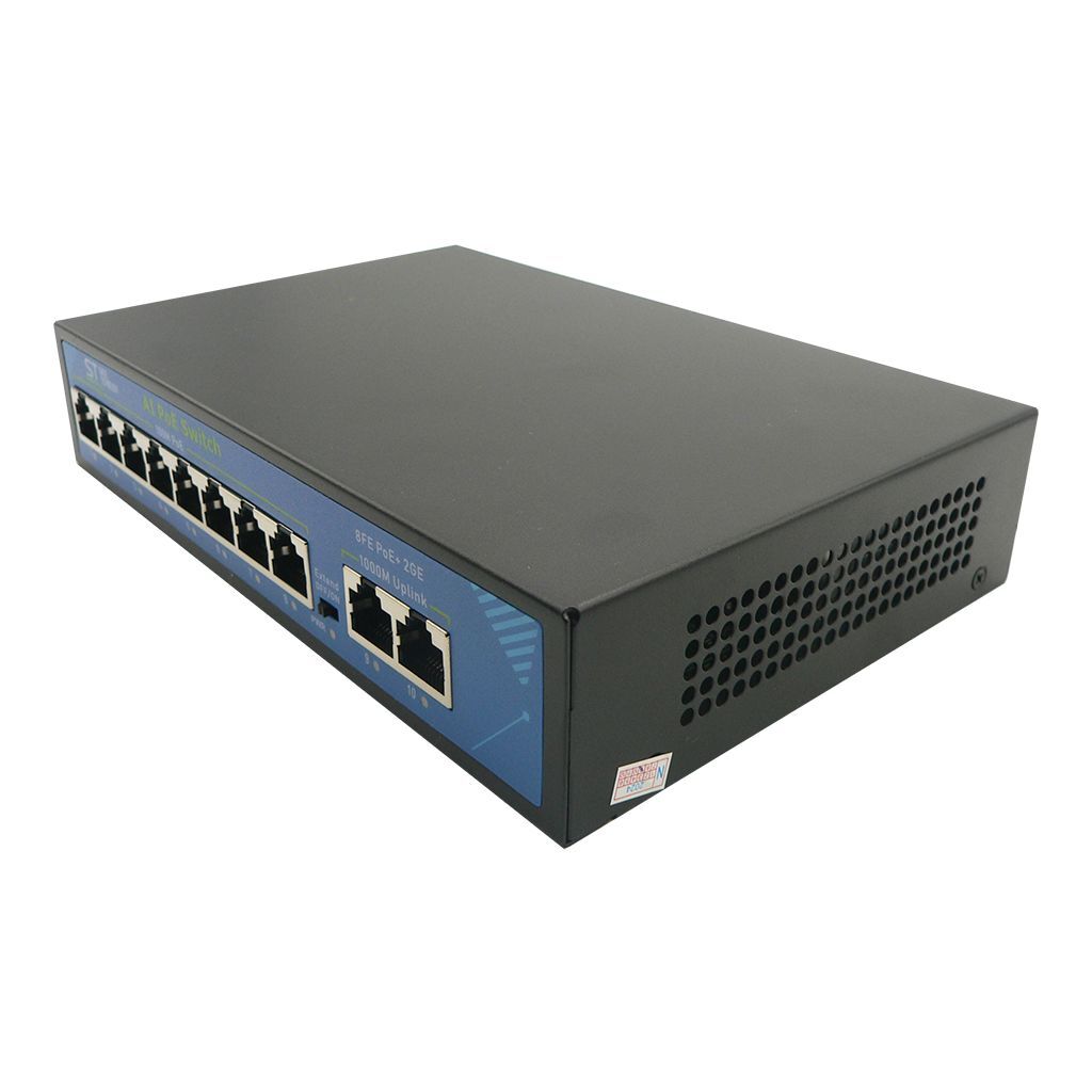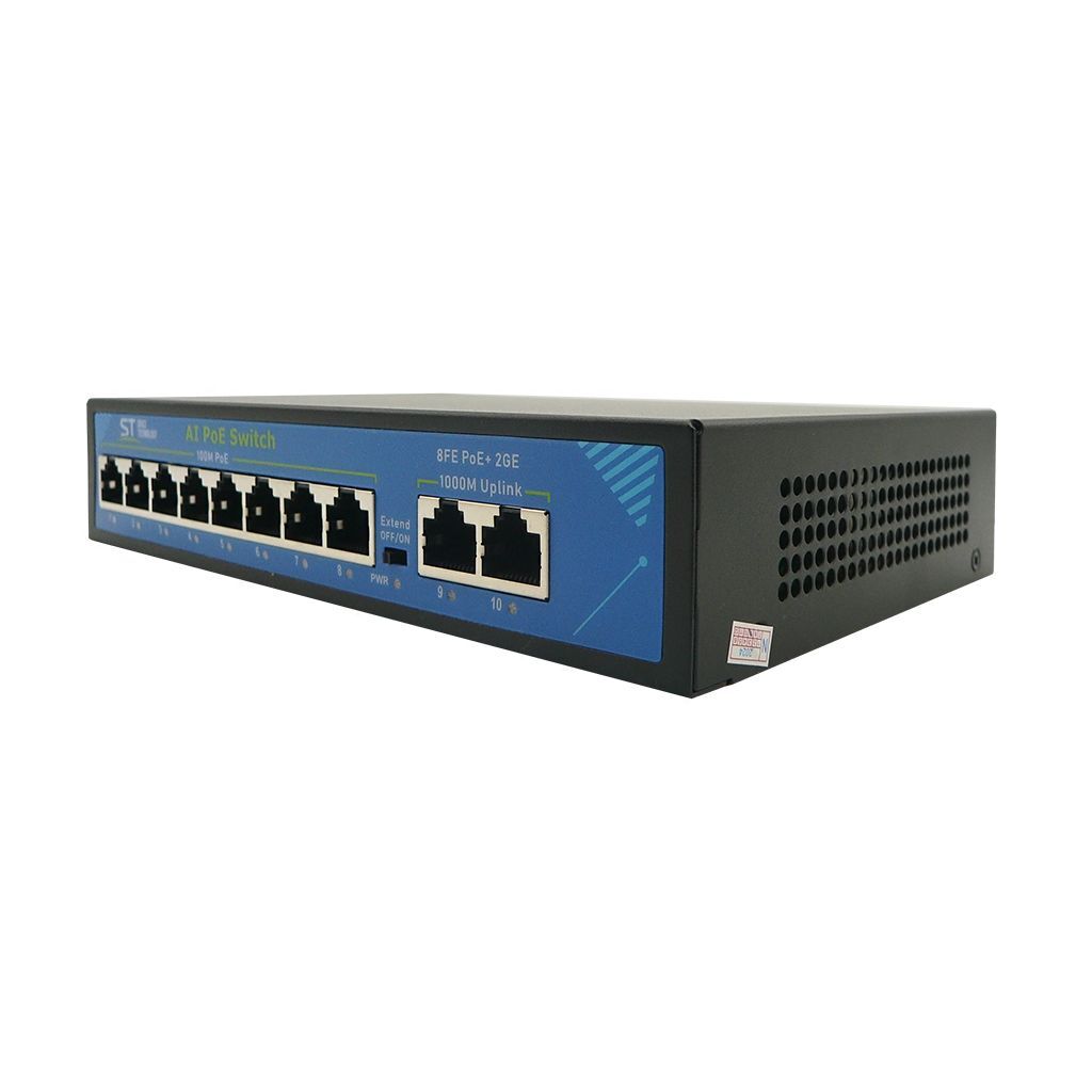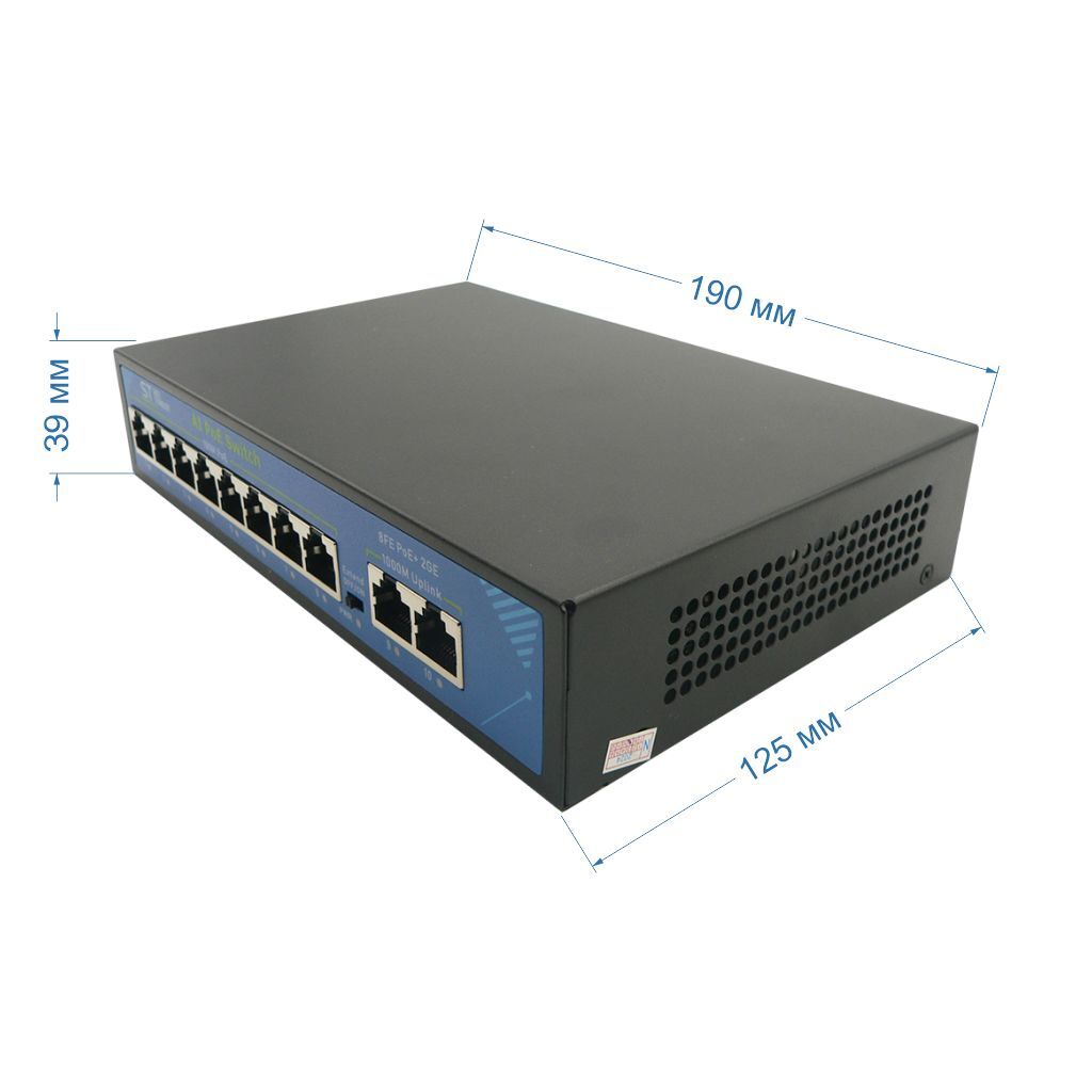ST-S86POE (2G/120W/А) PRO, (версия 2), Switch POE 8-ми портовый для обеспечения проводных сетей напряжением 48В, защита от КЗ, Extend 250м., AI PoE, AI VLAN, Грозозащита, PoE порты: 8 х (10/100 Мбит /с), UpLink порты: 2 х (10/100 /1000 Мбит /с), SFP порты: нет, Max.пропускная сп-ть: ДО 1000 Мбит /канал, Uвых: 48 (±10%), Р(ном) каждый порт (Вт): 15 Вт, Р(макс) каждый порт (Вт): 30 Вт, Р(сумм) общая (Вт): 120 Вт, Тип РоЕ: А, Коммутационная способность (Гбит/с): 5,6 Гбит /с, AI PoE(watchdog)/Vlan/Extend, Система охлаждения: пассивная, Активное РОЕ Металл, Температура эксплуатации: От -45°C до +55°C, Габариты изделия, мм.: 190х125х40 мм