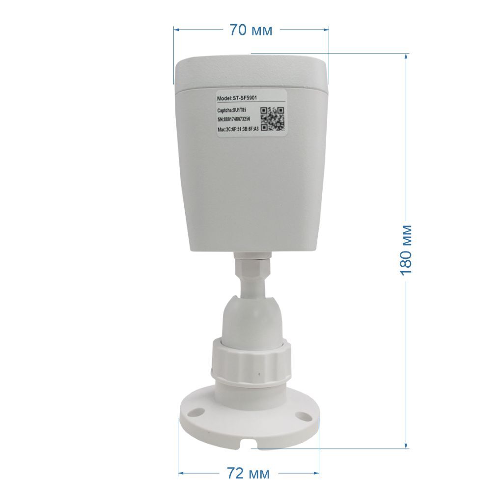 Видеокамера ST-SF5901, Белый, цветная IP,Разрешение: 5Mp (2880*1620), с ИК подсветкой,3 приватные зоны/коррекция углов/зеркалирование,детектор движения/человека, Цилиндрическая, Фокусн. расст.: 2,8 мм (Гор.111°/ Верт. 61°/Диаг. 129°) , Сенсор: 1/2.7” progressive scan CMOS, Дальн. ИК подсветки: до 30 м, Светочувствит. (мин. освещ.): 0,02 Lux (цвет) / 0 Lux (с IR), Кодек сжатия: H.264/H.265/MJPEG (только второй поток), Кодек сжатия аудио: G.711A/U , Аудио вход/выход: Встроенный микрофон/-, Дополнит. возможности: 3 приватные зоны / коррекция углов/зеркалирование, Напряжен. питания: 12 В, PoE: 802.3af (вариант А/В), ИК-фильтр: Механический, Функц. улучш. изобр.: BLC/ HLC/ DWDR/DNR/ AWB/ MWB/Anti-flicker, Smart IR: есть, CV380, IPEYE, Кол-во к/с: 30 к/с, Регулир. кронштейна: 3D-Ось, Раб. темп.: -30...+60, Материал корпуса: Металл, пластик